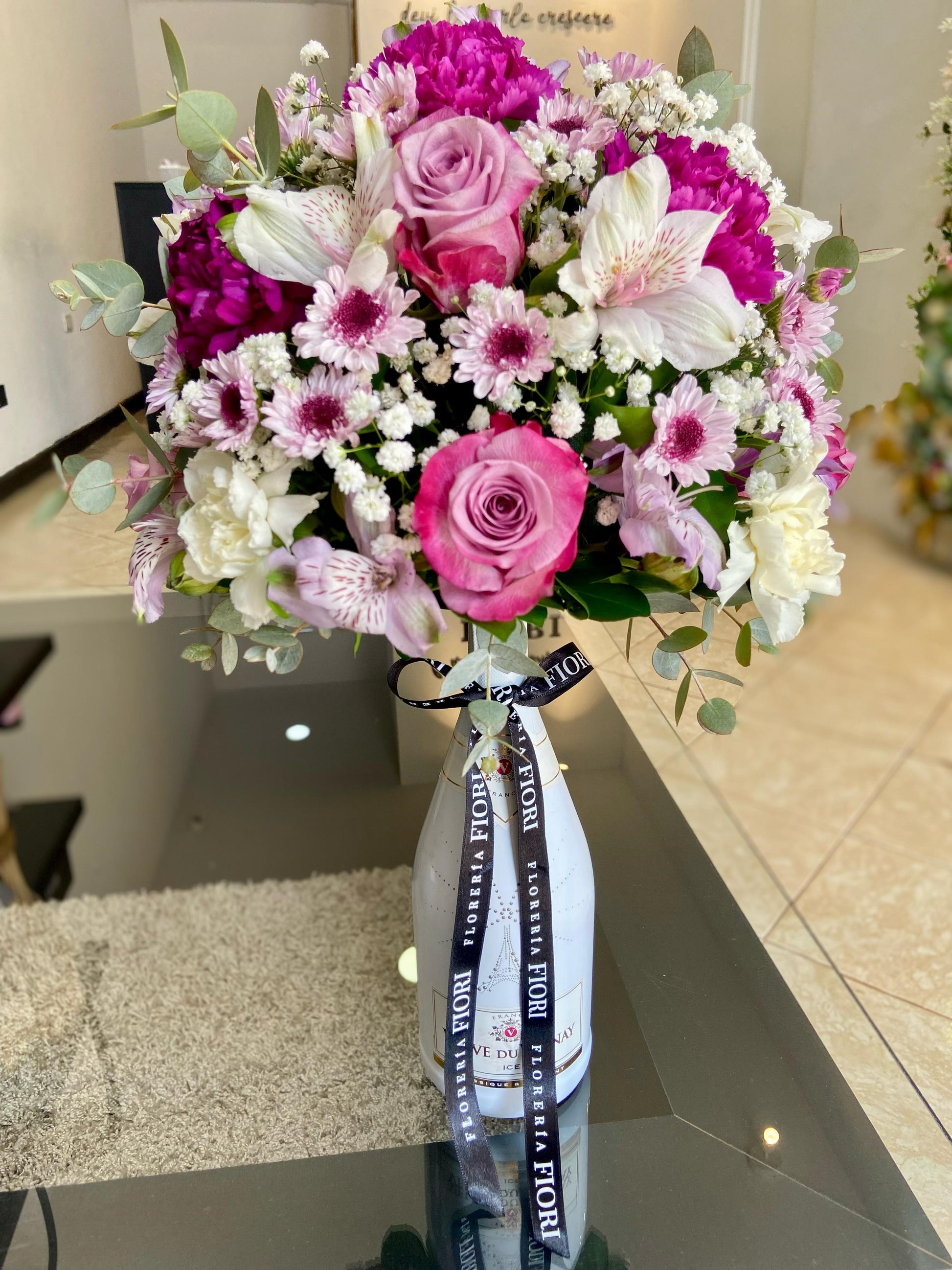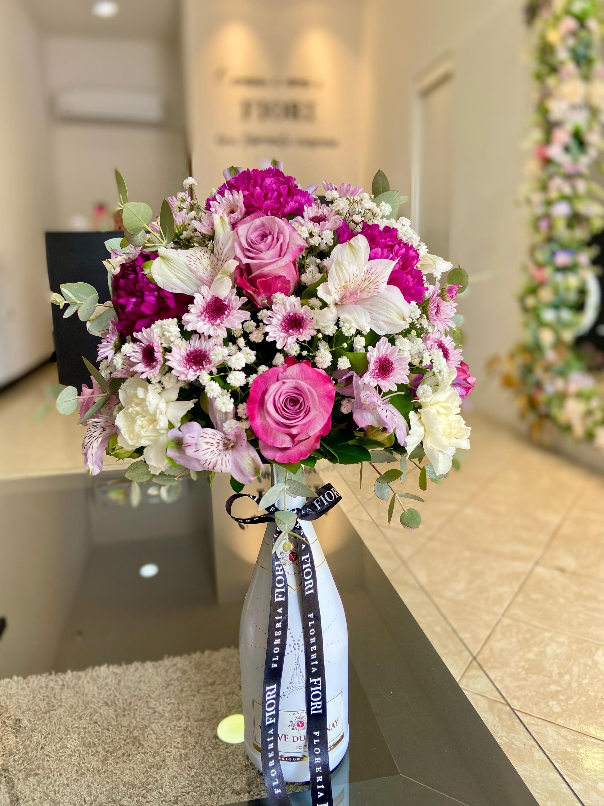 CHAMPAGNE CON MIX DE FLORES EN TONOS LILAS.