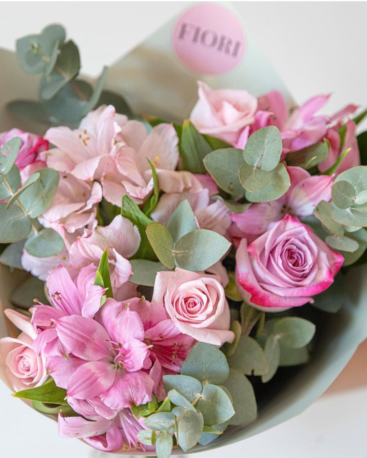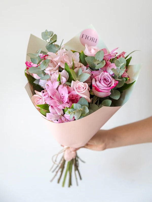 RAMO CON ROSAS LILAS Y ROSADAS, MAS ASTROMELIAS Y FOLLAJE.