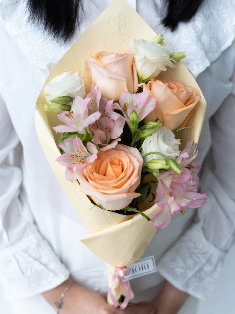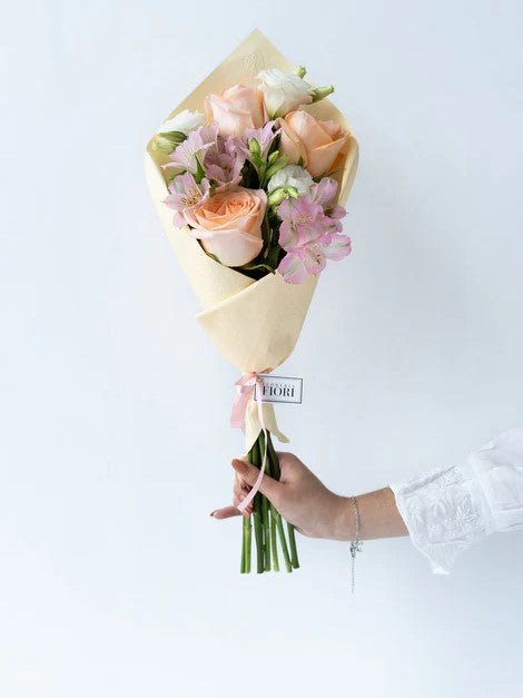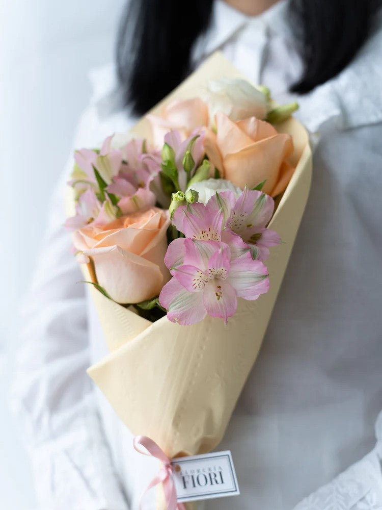 ROSAS SALMON, LICIENTHUS Y ASTROMELIAS EN TONOS PASTELES
