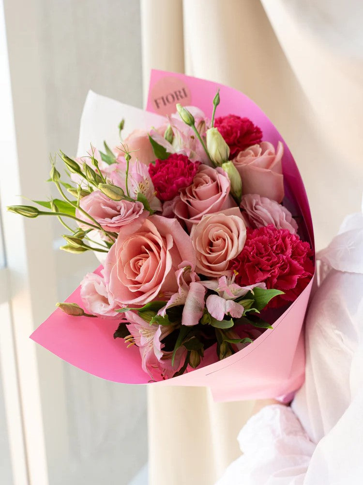 ROSAS ROSADAS, CLAVELES EN TONO FUCSIA, ASTROMELIAS ROSADAS Y LISIANTHUS
