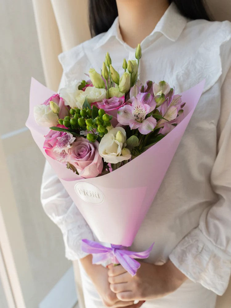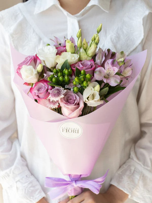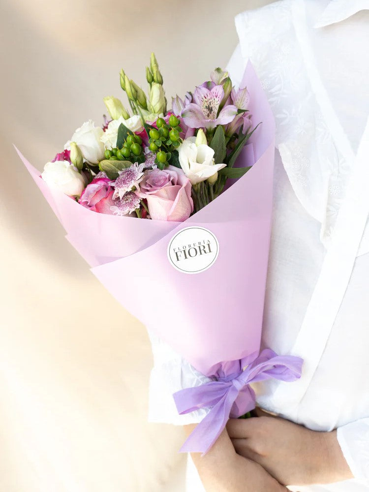 ROSAS LILAS, ASTROMELIAS LILAS, LISIANTHUS BLANCAS, OJO DE GATO, HIPERICUM
