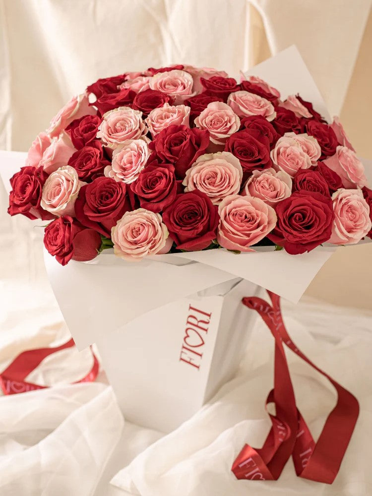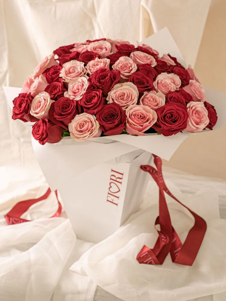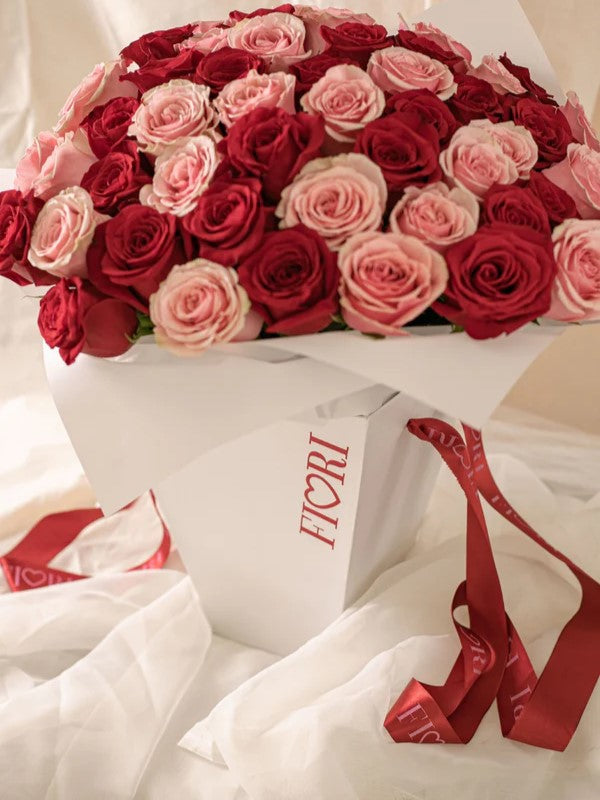 MIX LOVE ( RAMO DE CINCUENTA ROSAS EN TONO ROSA Y ROJO CON BOLSA PORTA MANO